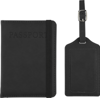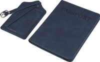 Recycled PU passport holder and recycled PU luggage label packed together in a brown carton box with illustration. The passport holder features "PASSPORT" printed on the front and has two inside slots for securely holding a passport. Both items are finished with an embossed recycled logo.